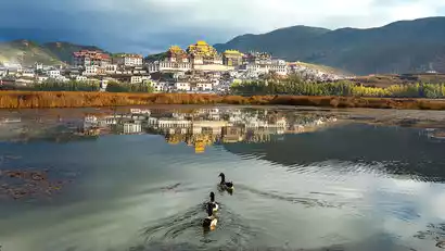 If you feel like visiting Dukezong Ancient Town, you can take some free time to create and shoot. We recommend visiting Guishan Park, located high above Dukezong, where you can find a tall, gilded, pure copper prayer wheel. It is 21 meters high and weighs 60 tons, and has been included in the Guinness Book of World Records.