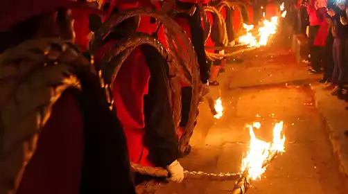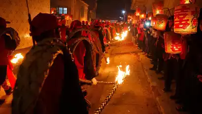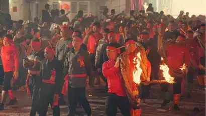 Guanshuo Village in Yujiao Town, Jiedong District, is renowned for its traditional "fire torch parade" during the Lunar New Year's traditional temple fair. From the 17th to the 19th day of the first lunar month, the Guanshuo Jingxing Temple Fair is held. During this period, villagers, young and old, visit the ancestral hall to worship their ancestors and participate in the "god parade." On the nights of the 18th and 19th day of the first lunar month, villagers, carrying lanterns, gather in front of the village to watch the fire torch parade. During the parade, men, wearing red scarves on their heads and red sashes around their waists, carry a 10-meter-long fire torch woven from three strands of bamboo strips on their shoulders. Amidst the clamor of firecrackers, gongs and drums, and cheers from the audience, they light the torch and parade around the village, creating a lively and spectacular scene. The entire fire torch parade lasts about two hours. After the event, the men take the remaining torch back home and place it in the hearth, wishing for prosperity and prosperity in the new year.