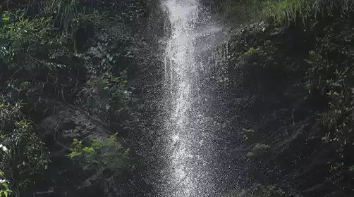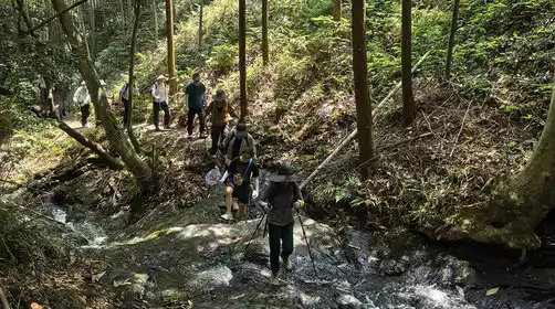 After the meal, we continued our journey and hiked up against the waterfall. The stream tumbled down the mountain and meandered, forming a chain of waterfalls like a pearl necklace. Mist rose in the mountains, as if we were in Penglai Mountain. The perceived temperature was much lower than in the city, and the visual senses were greatly satisfied.