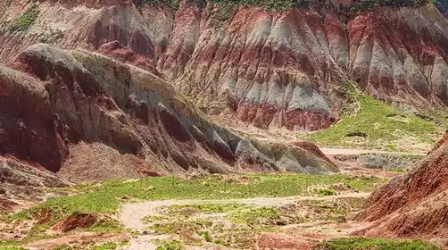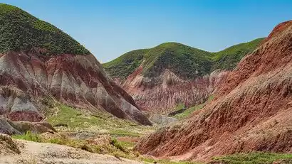 The first stop is the Secret Danxia Land. Near Lanzhou, the Yellow River and Danxia collide to create a rare spectacle: "Green water reflects red peaks." The red sandstone here dates back to the Cretaceous period, and erosion over millions of years has shaped the steep cliffs, jagged stone pillars, and cascading canyons. Unlike the magnificent Zhangye Danxia, Shuiju Danxia, due to its proximity to a reservoir, has a turquoise river surrounding the red mountain, creating a unique "Danxia on Water" landscape.