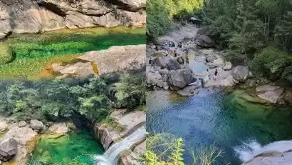 Arrive at Huangshan Lover - Emerald Valley, the "Fifth Wonder of Huangshan" secret place. It is one of the filming locations of the movie "Crouching Tiger, Hidden Dragon". The colorful pools are surrounded by bamboo sea. The temperature in the canyon is 5-8℃ lower than that in the city. Water wading and tracing the stream will instantly cool you down. It is a natural air-conditioned room. Cooling down and playing in the water is the theme on a hot afternoon.