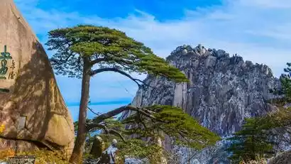 The symbol of Huangshan, a thousand-year-old tree, leans against the Green Lion Stone, with the majestic Tiandu Peak in the background.