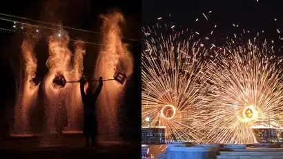 Qiyun makes iron flowers, about 5 minutes (visitor center): "Golden flowers fall from the iron tree, and thousands of stars bloom." The molten iron rises into the air in an instant, and the paddle is swung, hit, and hit, and the glittering iron flowers turn into stars in the sky.