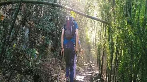 After arriving at the starting point of the hike and warming up for a while, we officially started to walk up the bamboo forest, passing through farmland, bamboo forests, tea plantations, and shrubs.
