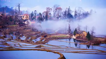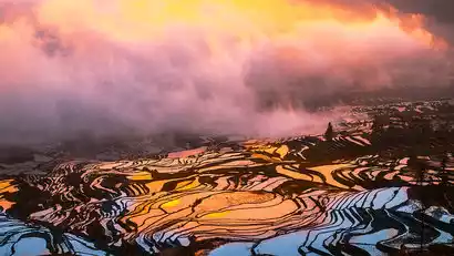 Head to the Yuanyang Rice Terraces, a World Cultural Heritage site known as the "Sculpture of the Earth." This season, the terraces are fully flooded, forming a 170,000-acre "Sky Mirror." In the early morning, the sea of clouds billows, and at sunset, it looks like the wind is blowing magma down from all over the sky. This is the most spectacular time of the year.
