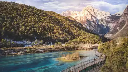 After lunch, take a scenic shuttle bus to Blue Moon Valley. Formed by the confluence of snow from Jade Dragon Snow Mountain, Blue Moon Valley, commonly known as the "White Water River," gets its name from the azure blue waters and crescent-shaped valley. It's said to be the inspiration for the Blue Moon Valley in British author James Hilton's "Lost Horizon." Strolling along the lakeside, you'll see the water shift from light blue to dark blue and then to emerald green, layer upon layer, in a breathtaking array of colors, depending on the light and perspective.