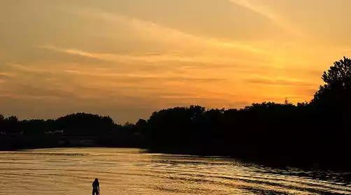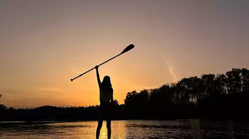Chasing the sunset on a paddleboard, the breeze is gentle under the orange sky.
