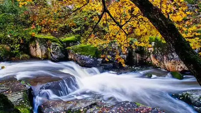 Fairy Pool: The geological wonder of a pool sandwiched between two peaks is reborn in autumn. The golden color of birch trees, the red of maple trees and the evergreen pine needles are reflected in the mirror-like blue lake, forming a dreamy scene of "water and sky being one color".