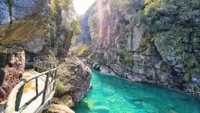 We arrived at the [Zhangshan Grand Canyon] and started to play in the cool water in summer. As we went deeper into the canyon, the roar of the waterfall and the sound of flowing water reached our ears. The mountain spring water circled along the winding stream beach. In the clear stream, we could see the goose-warm stone riverbed and swimming grouper. As we went up the mountain, the color of the water gradually became darker, like a glass-colored stream that made us linger. It can be said to be the ceiling of jelly water in southern Anhui.