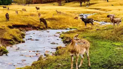 Visit Deer Creek Ranch at the right time and follow the deer to the birch forest or streamside. You can capture the dynamic moment of the deer's hooves crushing the fallen leaves at a low angle, or shoot the lively scene of the deer diving down the hillside to drink water at a wide angle.