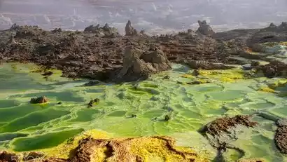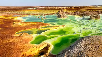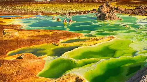 Today we'll set out early to explore the breathtaking landscapes surrounding Dallol. The Dallol Depression, at 116 meters below sea level, is one of the lowest and hottest places on Earth. The Dallol Volcano, though covered in thick layers of salt, still reveals its remarkable salt formations, hundreds of fumaroles (gas vents), and a vibrant acidic lake. We'll then explore other highlights of the area.