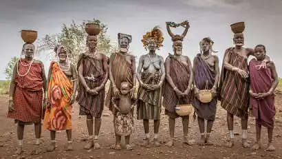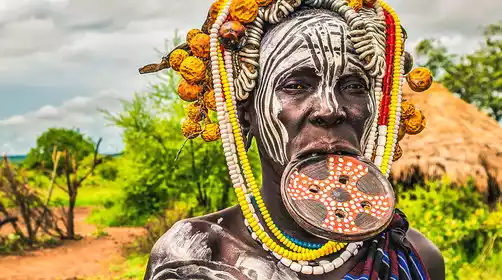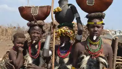 This morning, we'll visit the Mursi tribe to photograph their lip plates. The lip plate tribe generally refers to the Mursi people, primarily found in the Omo River Valley. Women in this tribe begin piercing their lower lips in their teens, using clay or wooden plates to enlarge their lips. Larger plates symbolize higher status and beauty, and are associated with larger dowries when they marry. Afterwards, we'll return to Jinka for lunch.