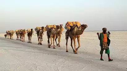 In the evening, we depart for Lake Assal. Here, we'll not only witness traditional salt mining but also encounter camel caravans transporting salt blocks to the Ethiopian plateau. We'll also photograph the sunset over the salt lake.