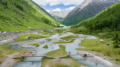 and arrive at Xianghua Village around 9:00 AM. Transfer to a local transfer bus to visit the Sky Ranch. Standing on the mountain meadow pasture, you can overlook the snow-capped peaks, watch cattle and horses strolling, and be surrounded by the forest. It is a great place to check in and take photos (October is approaching autumn, and the meadow is slightly yellowish).