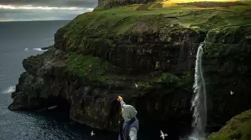 We'll embark on a light hike along the lakeshore. Initially, the path is gentle across the meadows, but the scenery becomes increasingly magnificent as we approach the cliffs. We'll eventually reach a clifftop viewpoint, offering the perfect vantage point for capturing the Hanging Lake. The lake appears to be suspended high above, while the Atlantic Ocean crashes a hundred meters below. On the return journey, we'll visit Bøsdalafossur Waterfall, where the water cascades down the cliffs directly into the Atlantic Ocean, creating a rare Nordic spectacle.