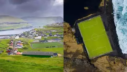 Upon arrival in Eiði, visit the seaside football field, nestled among the mountains. This lush green field, seemingly suspended above the sea, is considered one of the most beautiful football fields in the world. Stop here and experience this wondrous fusion of nature and humanity.