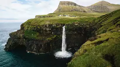 Arriving at the western end of the archipelago, starting from the parking lot, follow the trail to the Faroe Islands' iconic attraction, Múlafossur Waterfall. The waterfall cascades down from a towering cliff into the azure Atlantic Ocean, with the rolling hills of Vágar Island and its scattered cottages behind it, forming a beautiful picture.