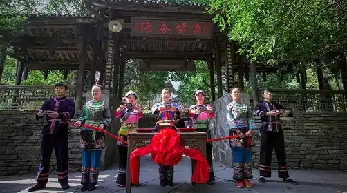 Entering the village is a highly interactive experience, with everyone experiencing a unique local welcoming ceremony: passing through three gates—drinking gate-blocking wine, stepping over a winnowing basket, and singing with the ayahs. Afterward, enjoy authentic ethnic performances, including Miao songs and dances, wedding performances, and a display of ethnic costumes. Dehang is truly a drum village, and the drum is a symbol of Miao culture, becoming a spiritual totem. Their most exciting performances are the drum music performances!