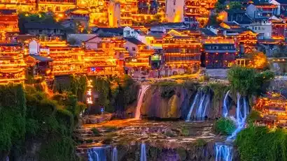 Arrive at the vibrant New Year atmosphere of Furong Town , known as the "Millennium Ancient Town Hanging on a Waterfall." With a history spanning over 2,000 years, it's one of the four great ancient towns in western Hunan. It boasts winding streets and alleys, Tujia stilt houses nestled by the water, and a five-mile-long street paved with bluestone. A small river flows along the town, cascading down a cliff as it joins the Youshui River, creating the spectacular Furong Waterfall.