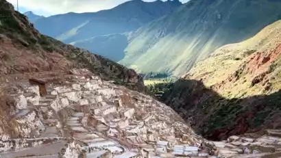 The Maras Salt Mine, located between Ollantaytambo and Cusco, flows from a naturally salted stream. From a single source, a trickle of water flowing down from the mountains creates a series of gravity-fed stills, each a few centimeters lower than the previous. This allows a steady but very slow flow of brine across its large, flat areas, drying into pure sodium chloride—table salt.