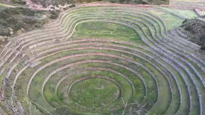 At the Moray archaeological site, we'll see the grandeur of the terraced fields, a prototype of Inca agriculture. Moray is a series of circular terraces used as an agricultural experimental center. The Incas used them to study the suitability of plants for new ecosystems. The overlapping circular stone rings widen as they rise, reaching a total depth of 150 meters.