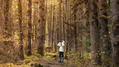 Arriving at the golden monkey base, we walked up the trail into the depths of the mountain forest, where we were surrounded by colorful trees and golden monkeys shuttled through the forest.