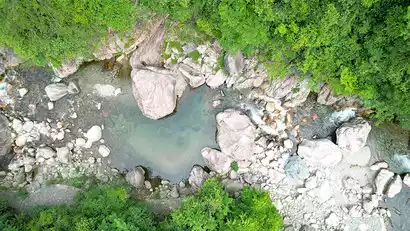 As you descend deeper into the canyon, the roar of waterfalls and the hum of rushing water fill your ears. Mountain spring water swirls along the winding streambed, revealing a rocky riverbed and swimming groupers. As you ascend, the water gradually darkens, becoming a glass-like hue that's truly captivating. It's arguably the pinnacle of jelly water in southern Anhui. Passing through Tianzi Lake and Yuyang Valley, you'll find numerous waterfront trails and pavilions along the way. The canyon is shaded by trees, keeping it exceptionally cool in the summer.