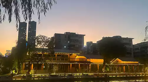 Enjoy Wuxi's nightscape along the way. Dusk drifts across the ancient canal, and the light strips along both banks gradually illuminate, outlining the gentle contours of the green tiles and white walls. A cruise ship passes, the sound of oars shattering the golden light on the river surface. Tourists whisper on the covered bridges along the shore, and warm lights filter through the wooden window frames of shops on both sides. The evening breeze, carrying the freshness of the water, sweeps across the docks festooned with red lanterns, transforming the night of the thousand-year-old canal into a flowing ink painting of the Jiangnan region.