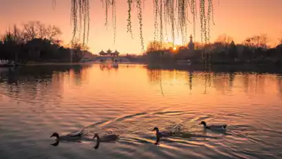 Slender West Lake in Yangzhou: Visit the park to photograph Slender West Lake (Yangzhou's iconic scenic spot, known for its thinness, blending southern gardens with northern landscapes. Its Five Pavilion Bridge is considered one of the "most beautiful bridges in China"). Capture the "Autumn Waves Reflecting the Pagoda" (Five Pavilion Bridge + White Pagoda) and the ripples on the water as a cruise ship passes by. In the evening, photograph the Twenty-Four Bridges at sunset.