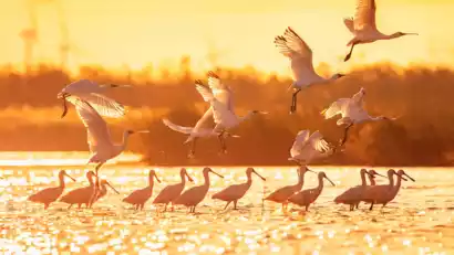 Bird Photography in Tiaozini: Head to Tiaozini Wetland (the core area of the Yellow Sea Wetlands, a World Heritage Site, and a key stopover on the East Asian-Australasian Flyway, where hundreds of thousands of migratory birds gather every year) to photograph flocks of migratory birds (such as geese, ducks, and shorebirds), and capture the spectacular sight of flocks flying over the mudflats.