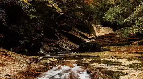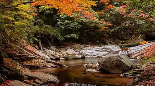 Then you can go to [Daxiaolanggou]. Compared with Black Bear Valley, this place has a different feeling. The whole valley is covered with bluestones with thick moss growing on them and many red leaves falling on them. The stream in the valley is not big, but it is winding, which is another different experience.