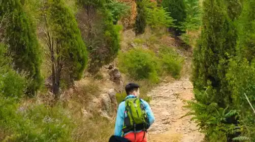Ascending the mountain path, the vegetation gradually transitions from low shrubs to taller trees, with ever-growing foliage forming a natural "green tunnel."