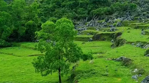 This is a leisure hiking route with ancient roads, Wanfeng Forest, green meadows and stone roads.