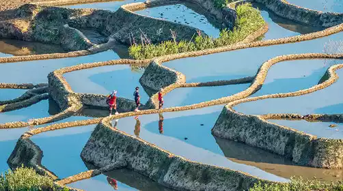 Depart for Yuanyang at the right time. Along the way, you'll encounter a dazzling array of tropical fruit stalls and banana groves undergoing harvest. After a short rest, we'll ascend the winding mountain road to the Ailao Mountains. Upon entering the Yuanyang Scenic Area, check in (depending on your arrival time) and head to Bada for sunset. As the sun sets, filling the sky with crimson clouds, standing in Bada, you'll see the terraced fields, carved by the Hani people for millennia into the Ailao Mountains, stretching far below. The mirror-like surfaces reflect the sunset, casting a warm golden hue, highlighting the graceful curves. One cannot help but marvel at the uncanny craftsmanship of man and nature.