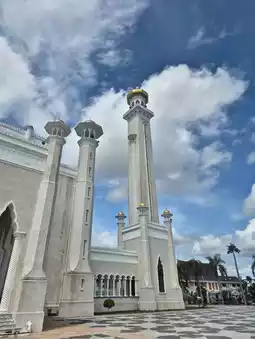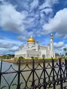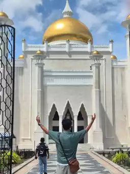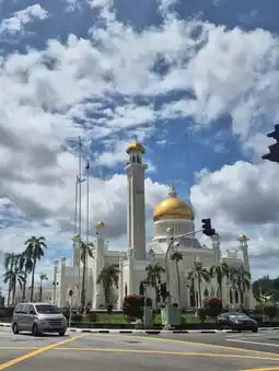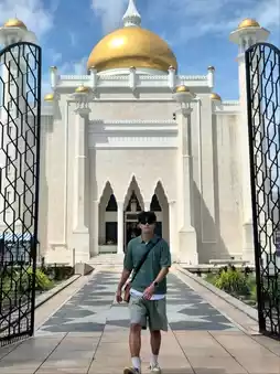 这座清真寺位于文莱首都斯里巴加湾市的中心地带,在城市中心竟然能找到这样一片宁静而宏伟的空间,真是令人惊叹。第一眼看到清真寺,我的目光就被洁白无瑕的外墙和阳光下熠熠生辉的金色穹顶所吸引。它的美丽令人震撼。