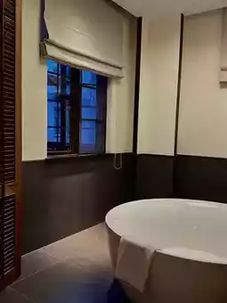 房间采用极简的侘寂风格,处处体现着贴心的细节,例如浴缸旁备好的浴盐。我最喜欢的是床头的纸艺灯;温暖的灯光洒在夯土墙上,瞬间营造出温馨舒适的氛围。