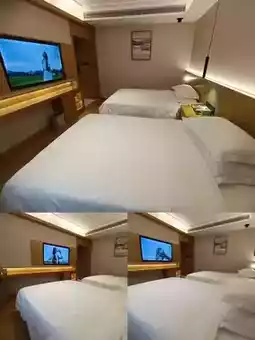 开门说“小渡小渡”,即可激活全屋智能系统:灯光、窗帘、空调、电视等均可语音控制,就连智能马桶的恒温清洗功能也能语音操控。淋浴间的智能显示屏实时显示水温,恒温花洒喷出的水流如春雨般细腻柔和,彻底告别“忽冷忽热”的尴尬。部分房型还配备100英寸巨幕投影仪,并联动智能照明系统,瞬间将房间变成私人影院,最大程度地营造夜晚的观影氛围。🛏️