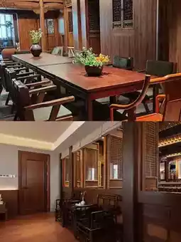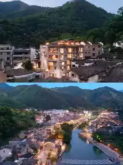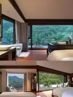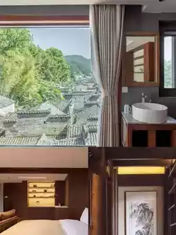 走进房间🌻,眼前的景色简直令人叹为观止。透过房间的落地窗,奔腾的卧龙潭和雅致的徽派村落尽收眼底🤔。据说整栋楼的主人花了六年时间精心设计建造。 💋从设计到建造,没有使用一颗钉子,所有的木雕、砖雕和石雕都是老工匠们纯手工打造的。👍🏻👍🏻