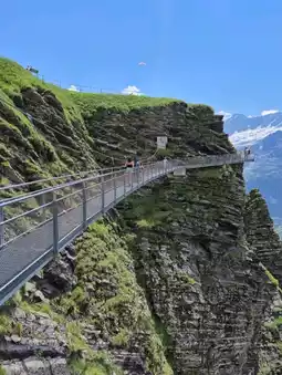 如此宁静,以至于我难以置信自己正站在悬崖之上。耳边只有风声,偶尔夹杂着人们的惊叹。向下望去,云雾缭绕在山谷间,时而显露出格林德瓦小镇的绿色,时而又将其遮蔽。那一刻,我不禁思索:“为什么瑞士的空气如此纯净?”这是一个惊奇胜过恐惧的地方——那一刻,我完全被眼前的景色所吸引,而非脚下的悬崖。✅️