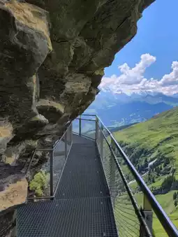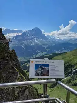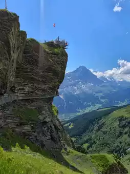 山 步道环绕悬崖而建,尽头是一个向前延伸的长长观景台。站在甲板尽头,映入眼帘的是巍峨耸立的艾格峰,它像一堵巨大的墙,山脚下是绿茵茵的草地和格林德瓦小镇。天空澄澈得仿佛触手可及,微风凛冽却令人神清气爽。阳光穿透云层,温柔地勾勒出群山的轮廓,宛如电影中的场景。🏔️