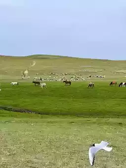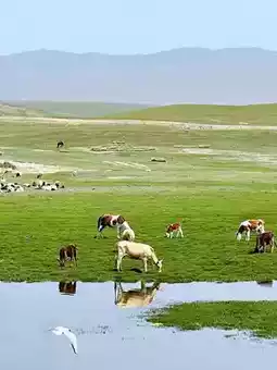 看到牛🐂、马🐎、羊🐑、骆驼🐫和天鹅🦢和谐共处,景色优美浪漫。❣️