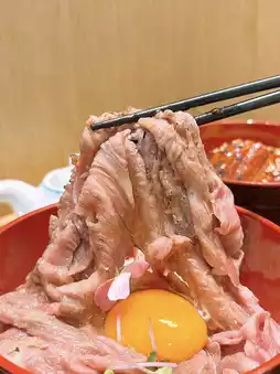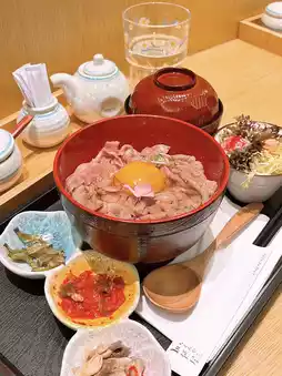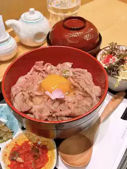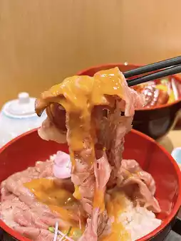 。这碗饭看起来很诱人。黑毛和牛铺满米饭,中间还放着一个生鸡蛋。和牛肉质软嫩,香气扑鼻。味道更浓郁