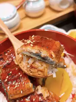 第一次来这里吃鳗鱼盖饭,三块大块的鳗鱼片都很厚实,合起来就是一整碗,肉质烟熏味十足,酱汁也调得恰到好处,吃起来不会很油腻,一碗吃完刚刚好