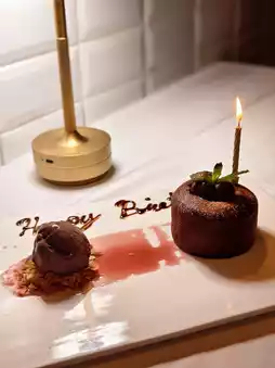 双拼巧克力蛋糕(Duo Di Cioccolato)是一款热乎乎的熔岩巧克力蛋糕🍫,搭配冰凉的巧克力冰淇淋,冷热交融,口感对比鲜明。服务员知道我是来庆祝我丈夫生日的,特意为我们写了“生日快乐”,还插上了蜡烛。——