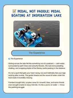 在湖面上滑行,仿佛置身于明信片中——平静的湖面,棕榈树和五彩缤纷的花朵环绕四周。我们轮流踩踏板,聊天,并拍摄远处隐约可见的迪士尼城堡。