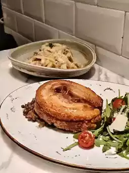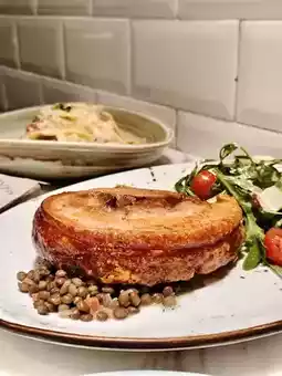 真的好大,需要两个人一起分享!猪皮超级酥脆!肉质非常嫩,肥瘦相间,入口更香,搭配略带辛辣的香肠和葡萄牙豆,减少了油腻感,但实际上,油腻程度比预期的要低,这真是太棒了👍🏻🍝