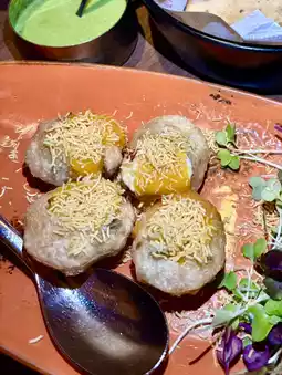 这道开胃小菜简直是夏日救星!酥脆的酸奶薄饼(Dahi Poori)包裹着香浓的牛油果和新鲜芒果,酸甜的滋味瞬间让我心情愉悦,一口下去根本停不下来!