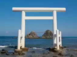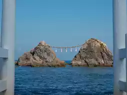 二浦最标志性的景观便是沙滩上的白色鸟居,以及静静伫立在附近的两块被称为“夫妻岩”的巨大岩石。较大的岩石代表丈夫(男性神祇伊邪那岐),较小的岩石象征妻子(女性神祇伊邪那美)。一条重达一吨的巨型注连绳连接着这两块岩石,象征着婚姻永恒的纽带和和谐的结合。每年春天涨潮时,都会举行庄严的仪式更换注连绳,延续着这一神圣的传统。