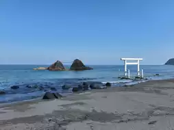 漫步在柔软的沙滩上,轻柔的海浪拍打着海岸,发出舒缓的声响。白色的鸟居在蓝天碧海的映衬下,显得格外庄严纯净。许多游客会等待退潮,站在鸟居下方,将鸟居和远处的母尾岩一起纳入画面,拍下充满诗意和祝福的纪念照。