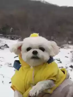 积雪厚厚的,仿佛置身于冬日仙境。狗狗穿着黄色雨衣,更加可爱了,清冷的空气让人感觉格外舒爽。